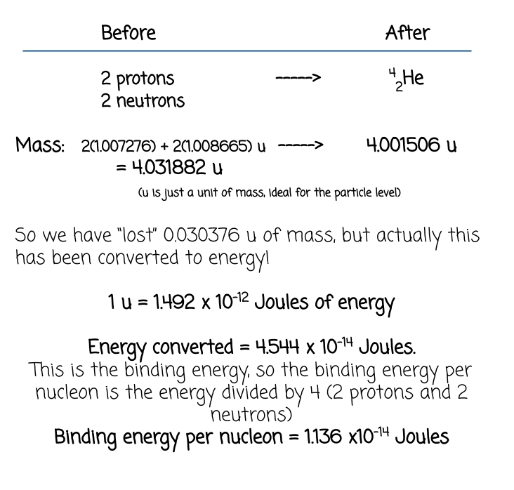 Above is a quick calculation of how much energy is released by making 1 helium nucleus. The formula E = mc2 shows the relation between mass and energy, so we can use this to convert between the two. This is how we find things like binding energy per nucleon.