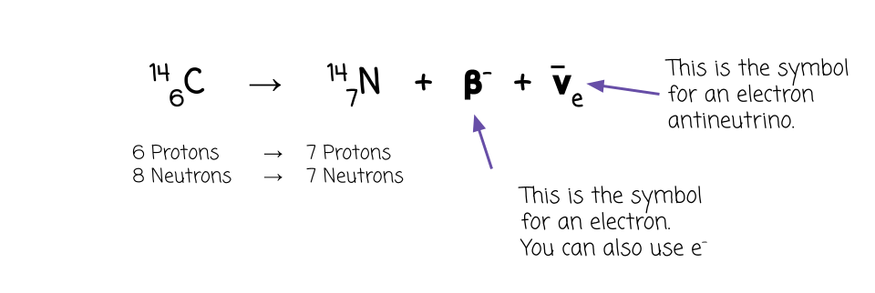 For example, carbon-14 has 2 too many neutrons, so it will convert 1 (not both!) into a proton. This makes Nitrogen-14, a nice and stable element. To balance out charges, an electron (plus an antineutrino) will also be released. In the case of turning protons to neutrons, a positron (and a neutrino) will be released.