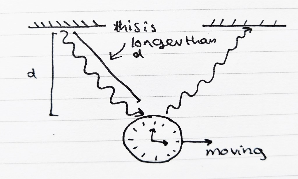 Now let’s move the clock sideways. The light path is now much longer than d, so it will take longer for the clock to tick. You could say this clock is moving through time slower, but interestingly the clock won’t realise it’s moving slower!