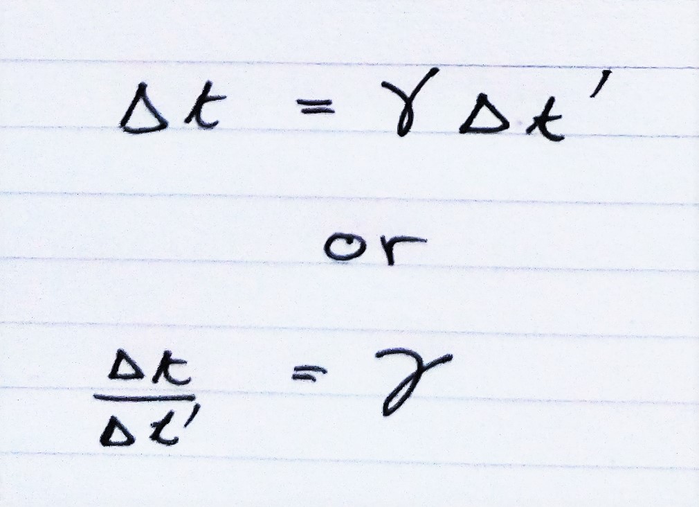 Now doesn’t that look good! It has the stationary observer’s time delta t’ equal to the moving clock’s time delta t multiplied by a factor gamma. For those super high velocities, the Lorentz factor is large and so that time dilation will be more drastic.