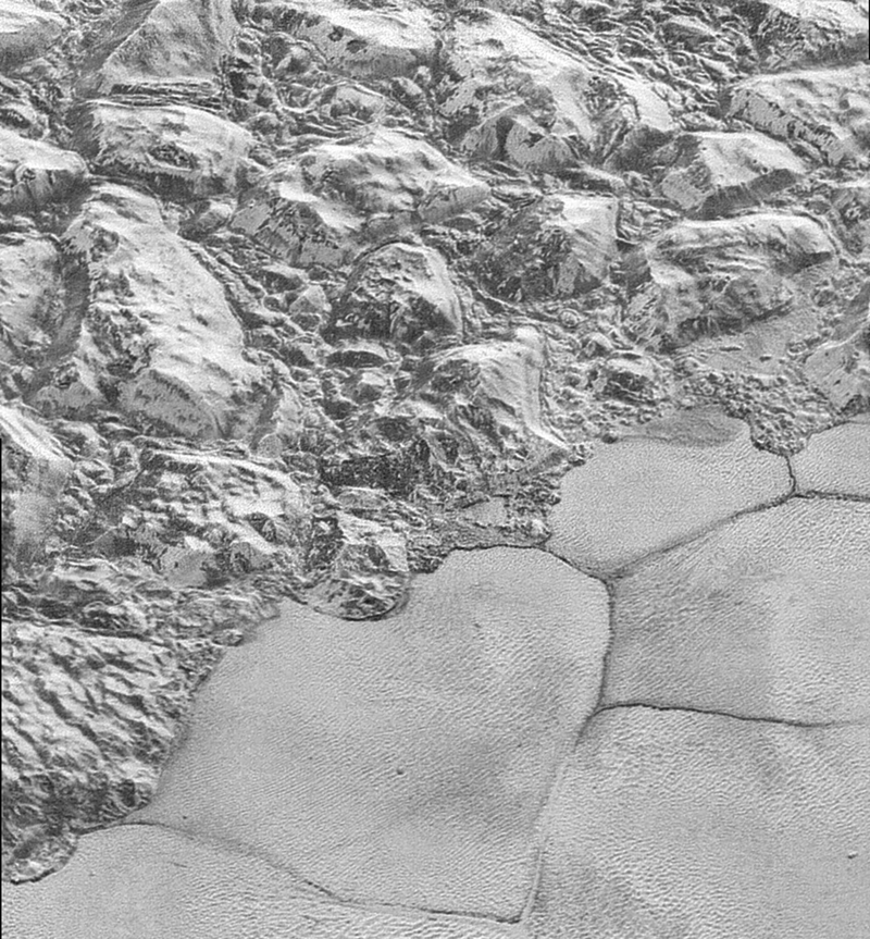 Tenzing Montes on the left, Sputnik Planitia on the right. Credit: NASA/Johns Hopkins University Applied Physics Laboratory/SwRI.