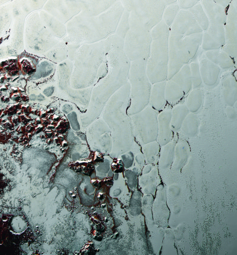 Coming back to Sputnik Planitia itself, it seems this nitrogen layer is split up. You might not see it well in the center but you can definitely see it on the outskirts. As explained by J Suarez et al, these are likely convection cells that indicate Pluto is geologically active, and this paper by Singer et al suggests Sputnik Planitia might engage in cryovolcanic resurfacing.