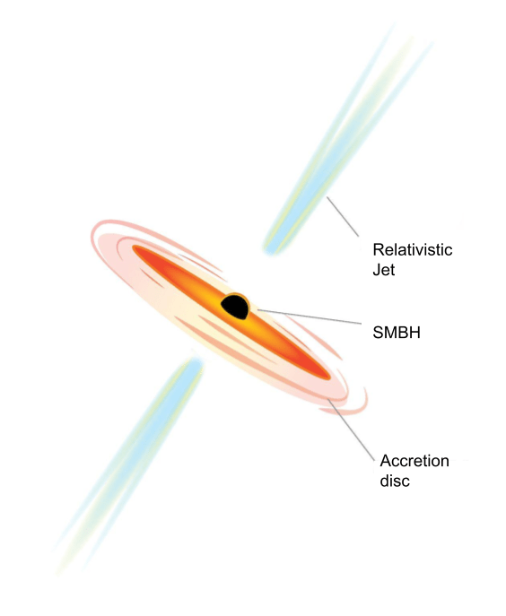 Active galactic nuclei (AGN) are early universe galaxies with extremely luminous cores, sometimes overpowering the stars in the galaxy such as in the case of quasars and blazars. There are 3 main parts of an AGN: The Supermassive black hole (SMBH), the accretion disc surrounding the SMBH, and sometimes there are 1 or 2 relativistic jets perpendicular to the disc’s plane.