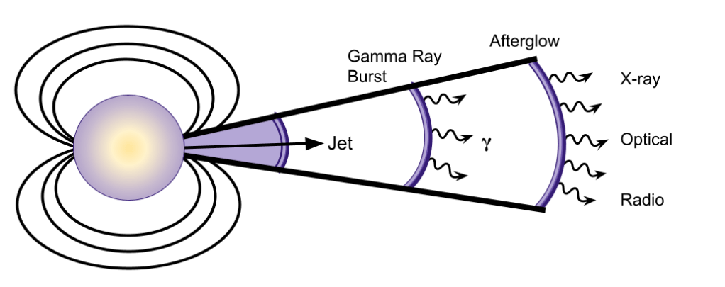 This is somewhat helpful as we have 2 events to fit our theories and models to, which leaves less room for guesswork in a way. The main theory as to how GRBs are made is the Fireball Model. In this model, the merging or collapse produces a series of internal and external shocks which expand due to thermal pressure. The high energy bursts and gamma rays are created when these shock fronts interact, and material is also shot outward at relativistic speeds.