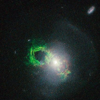 - It is an example of a galaxy merger that’s likely had a burst of activity and is now quietening down again. Merging always makes the most unique structures and is probably the cause of the green tidal tails which brings us onto point 3: