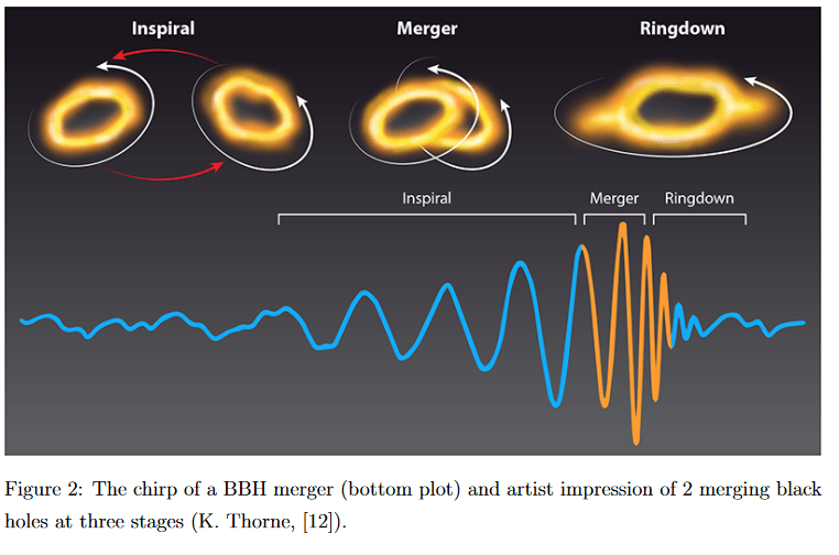 This phase is actually the inspiral, which occurs before the merging, where the separation of both black holes decrease and their orbits shrink up to the innermost stable circular orbit (ISCO). You can’t have stable orbit smaller than this, so at this distance the merging commences where both black holes combine. This ends with a newly formed black hole which gravitationally vibrates or “rings” at multiple frequencies. The ringdown is the damping of these frequencies.