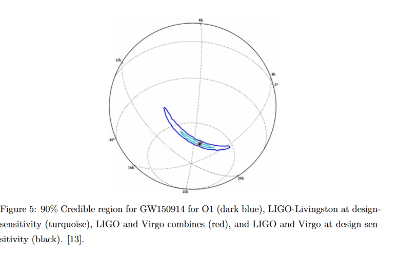 When it comes to the location on the sky, the accompanying uncertainty typically expressed as a 90% credible region (CR90). This is the area of the sky in which there’s a 90% chance of finding the merger. The credible region is actually hot dog shaped, which arises from the method of triangulation using multiple detectors. The picture below from B.P Abbott et al in 2018 (the one from Living Reviews Vol 21) shows this shape on a globe for the GW event GW150914.