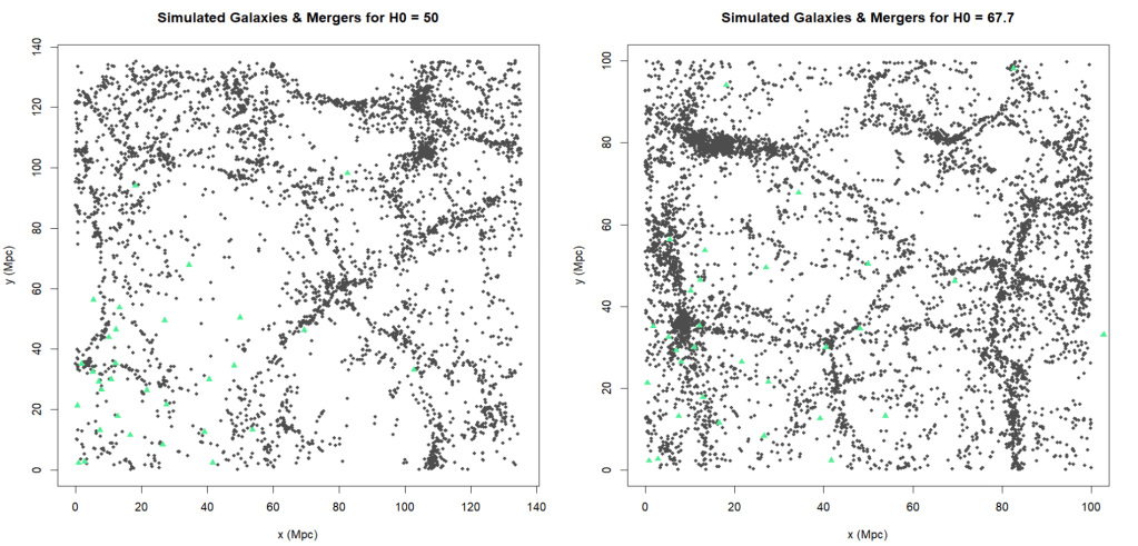 The mergers and galaxies in the left plot don’t match up well at all, in fact it appears as though all the mergers were generated in a void. The probability of Hubble’s constant being 50 is really low. Whereas on the right, the positions match up pretty well, which makes sense because 67.7 is the true value of Hubble’s constant in this simulation.